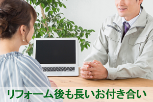 | 当社のリフォームは、打ち合わせ段階から色々とご要望を伺いプランを練り上げます。施工後のアフターメンテナンスの際もしっかりと記録を付けて、お住まいの住居が今どんな状況にあるかを把握しておりますので、安心してご相談下さい。また住居以外の店舗・事務所等のリフォームも多数実績がございます。 | ||