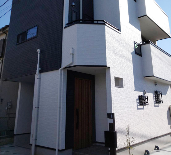 角地のすみきり部に玄関やサービスバルコニーを置き、すっきりとした外観にいたしました。