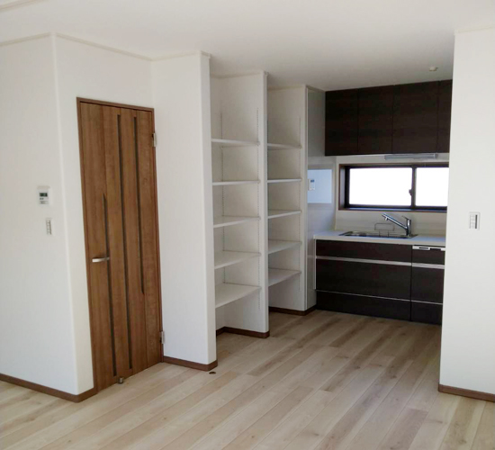 キッチンはシンプルには収納棚を作り、台所用品を簡単に収納できるように致しました。