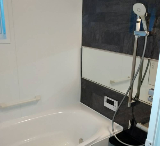 シンプルにまとまっバスルーム。入浴しながらも鏡を利用できます。